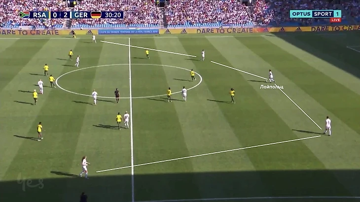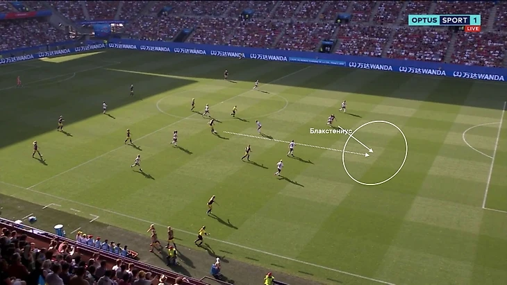 В начале второго тайма Мартина Восс-Текленбург поменяла схему с 4-3-3 на 4-2-3-1, укрепив тем самым опорную зону. Во вторые 45 минут с точки зрения обороны немки смотрелись гораздо лучше.