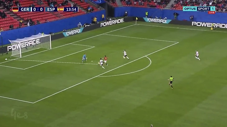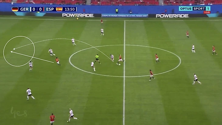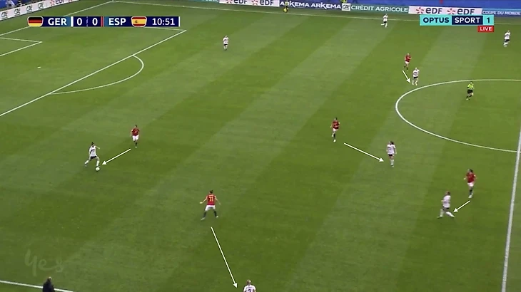 Испания вскрыла ещё два недостатка бундестим: недостаточно уверенная игра под прессингом и уязвимость к забросам за спину защитникам. Испанки на удивление играли очень смело против фаворита; контролировали мяч, территорию и оказывали давление: