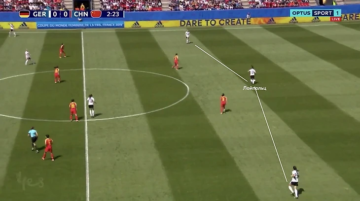 В игре с Китаем ярко проявилась первая проблема немецкой команды – уязвимость к быстрым атакам. Любая потеря мяча в центре могла обернуться для Германии катастрофой из-за отсутствия контрпрессинга. В первом тайме китаянки несколько раз убегали в контратаки, две из которых завершились опаснейшими моментами. Но в одном случае мяч попал в штангу, в другом – пролетел в метре от неё. Из-за плохой реализации собственных моментов Германия к перерыву могла гореть 0:2.