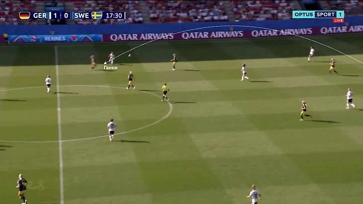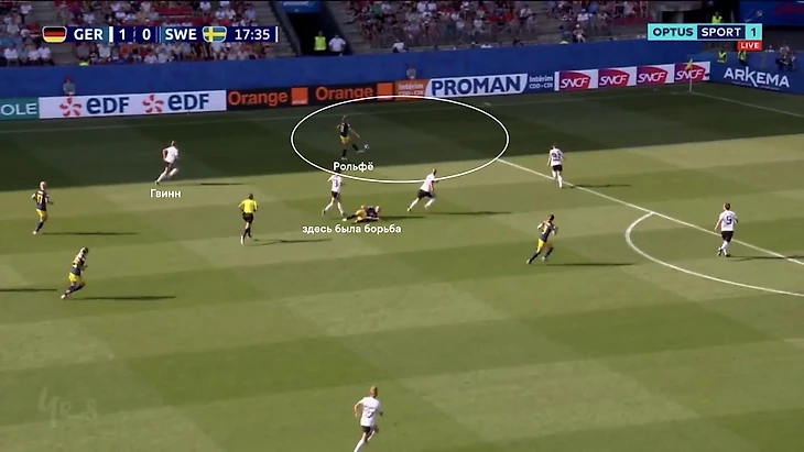 Другая особенность игры немецкой сборной, которую шведки активно использовали – высокие позиции фулбеков при розыгрыше. В этом эпизоде идёт подача на Гвинн, но Эрикссон не даёт Джулии принять мяч и выбивает его вперёд в борьбу: