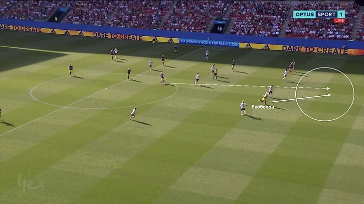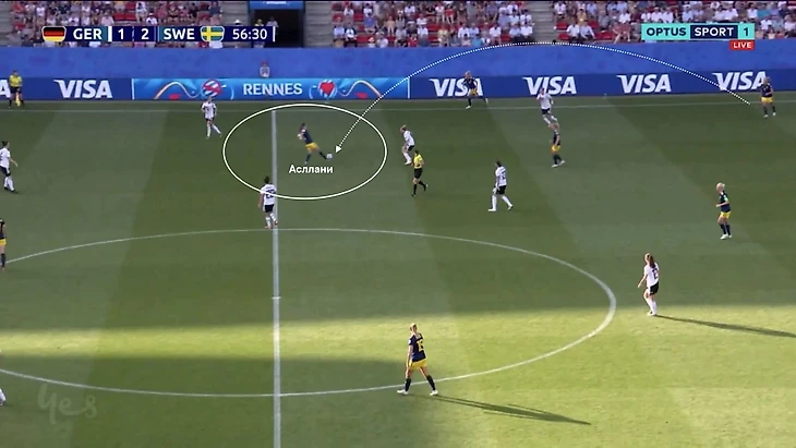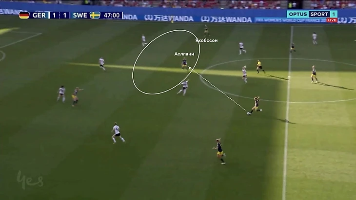 Шведки начали активнее использовать открывания Асллани в свободных зонах. Она опускалась с позиции форварда и искала пространство. То есть у Швеции появилась дополнительная опция в атаке помимо забросов на забегание:
