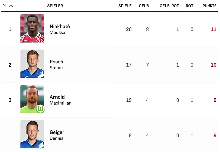 *игрок – кол-во игр – желтые – 1+1 желтые – красные – всего