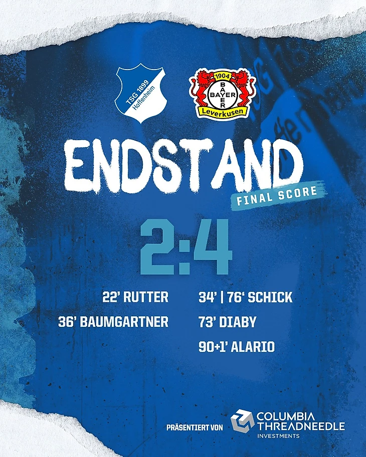 «Байер» после двух побед чуть не оступился в Зинсхайме. Команда из Леверкузена ушла на перерыв уступая и по ходу матча дважды проигрывала. Однако, во второй половине встречи клуб заиграл так, как у него получалось действовать на протяжении большинства игр в сезоне. Забил три безответных мяча, что принесло команде не только три очка, но и бронзовые медали чемпионата Германии! Главный голеадор «Байера» из Чехии Партик Шик оформил дубль. В этом чемпионате он забил 24 мяча и обосновалась на втором месте в списке лучших бомбардиров, но отрыв у лидера поляка Роберта Левандовски чудовищно огромный.