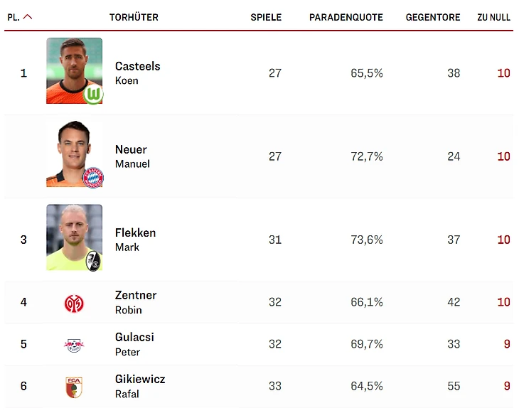 *игрок – кол-во игр – % отраженных ударов – пропущено мячей – матчи на ноль