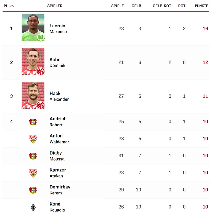 *игрок – кол-во игр – желтые – 1+1 желтые – красные – всего