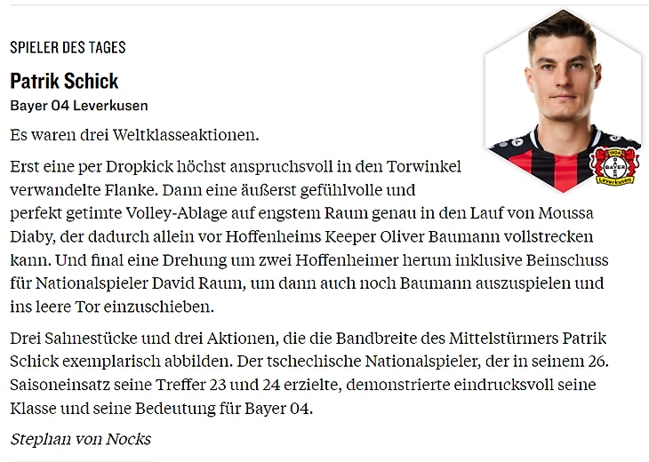 Патрик Шик забил свои 23-й и 24-й голы в сезоне Бундеслиги и продолжает гонку за рекордом Кисслинга, который был единственным игроком «Байера», забившим за сезон 25 раз.