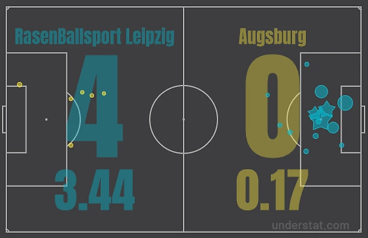 Оценка по xG для клубов практически диаметрально противоположная: «РБ Лейпциг» 4,63 – «Аугсбург» 0,30.