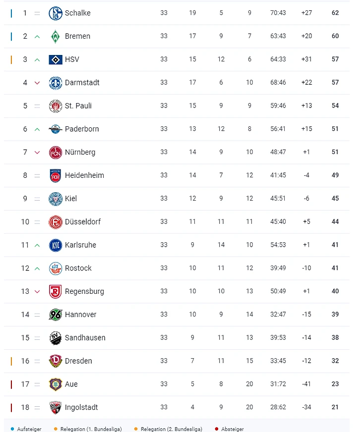 Таблица второй Бундеслиги перед последним туром и главное в ней - возвращение «Шальке».
