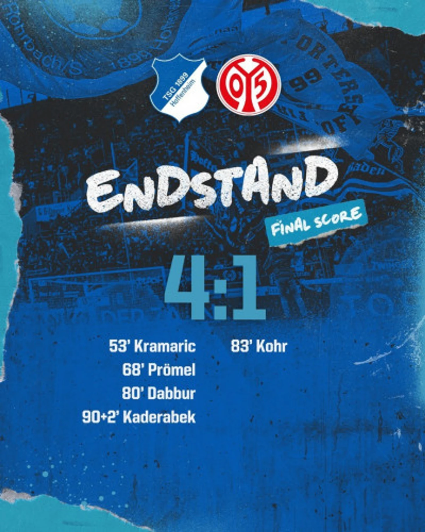 Исторически боевой «Майнц» является трудным соперником для «деревенских», тем более до этого обычно домашняя команда умудрилась выиграть три гостевых матча подряд. И эту встречу «карнавальщики» начали активно и с настроением, ни в чем не уступая хозяевам. Однако удача в этот день была на стороне «Хоффенхайма». Сначала Акпогума грубо атаковал Буркардта, который был вынужден покинуть поле. А в конце тайма Хака удалили за фол последней надежды и в ворота гостей был назначен пенальти. Правда, потерявший в последнее время уверенность Крамарич пробил мимо ворот, но во втором тайме игравший в меньшинстве «Майнц» не выдержал давления.