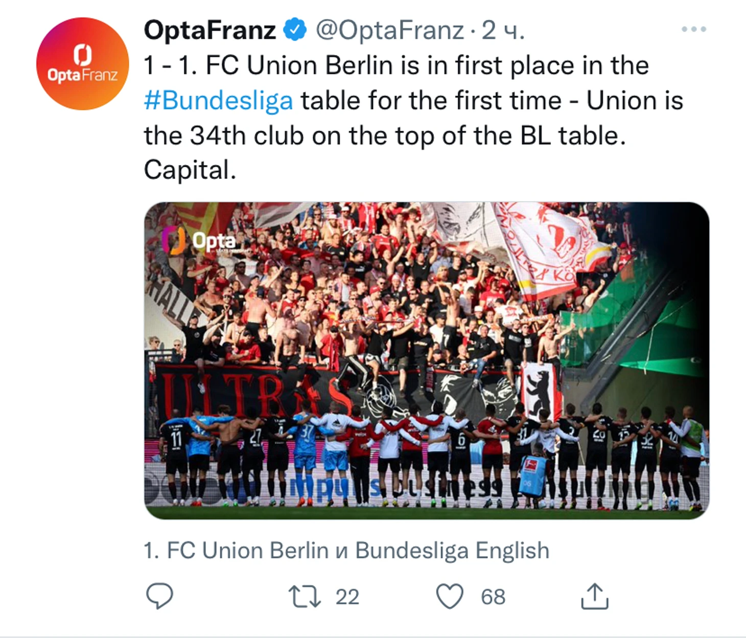 У «Униона» самая длинная беспроигрышная серия среди всех команд Бундеслиги (13 матчей, 10 побед, 3 ничьи).