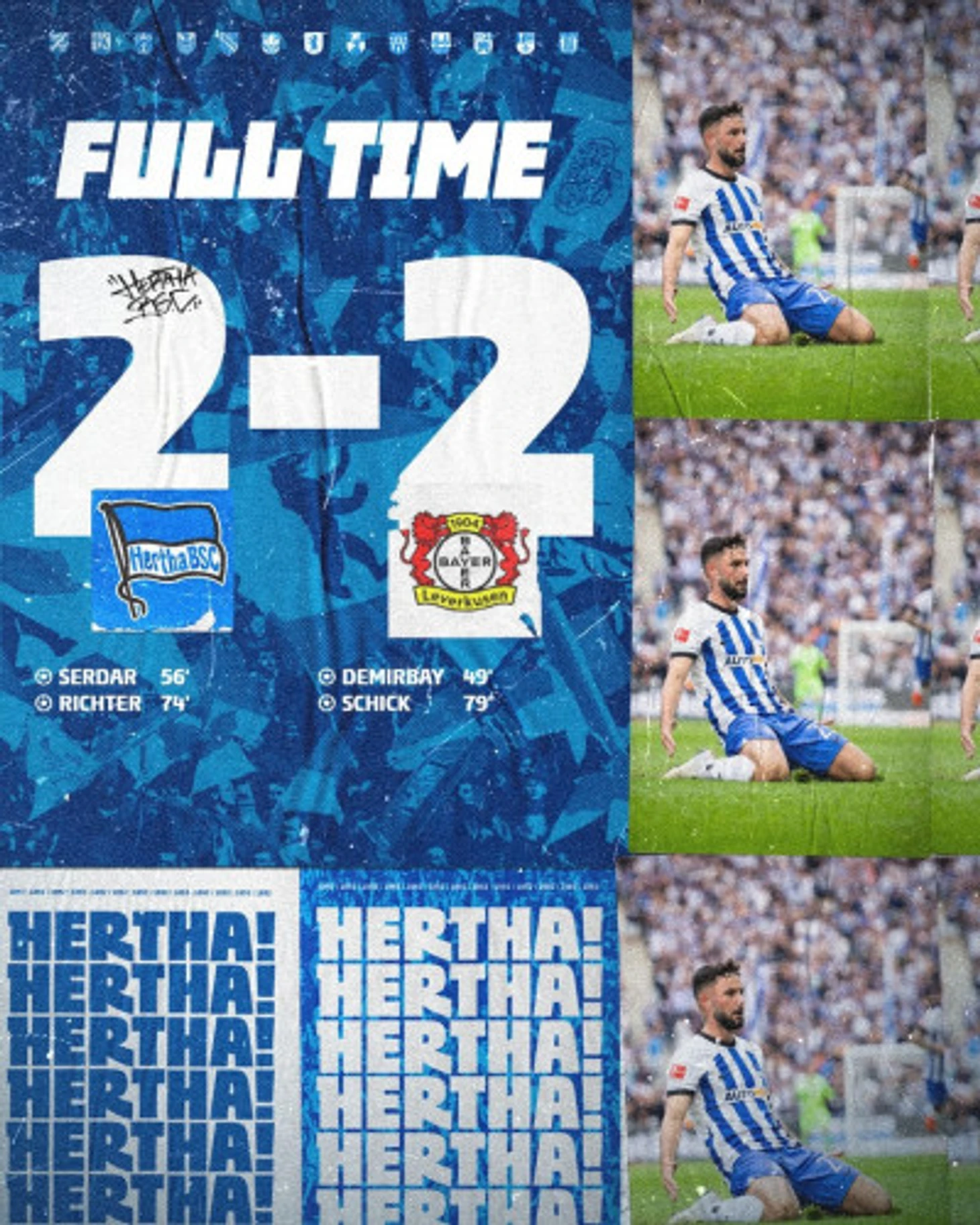 Обоюдоострая игра в первом тайме не принесла голов, но во второй половине матча команды как прорвало. Сначала Демирбай красивейшим ударом со штрафного поразил ворота Кристенсена. «Герта» не пала духом, пошла вперед и быстро ответила голом Сердара. А затем вышедший на замену Рихтер нанес потрясающий дальний удар без шансов для Градецки. К чести «аспириновых», они не сдались и сумели отыграться – Андрих покатил в штрафную, Азмун удачно пропустил мяч, а Шик отправил мяч в ворота. До конца встречи обе команды продолжали атаковать и имели свои шансы, но боевая ничья в итоге оказалась справедливым исходом.