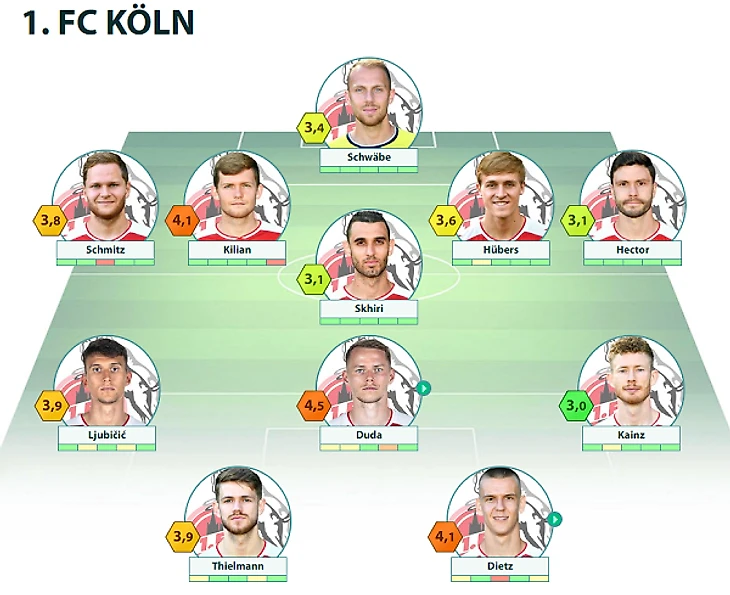 KOE: Schwäbe - Schmitz, Kilian, Hübers, Hector - Skhiri - Thielmann, Ljubicic, Kainz - Dietz, Adamyan