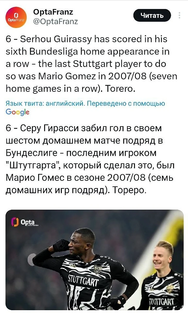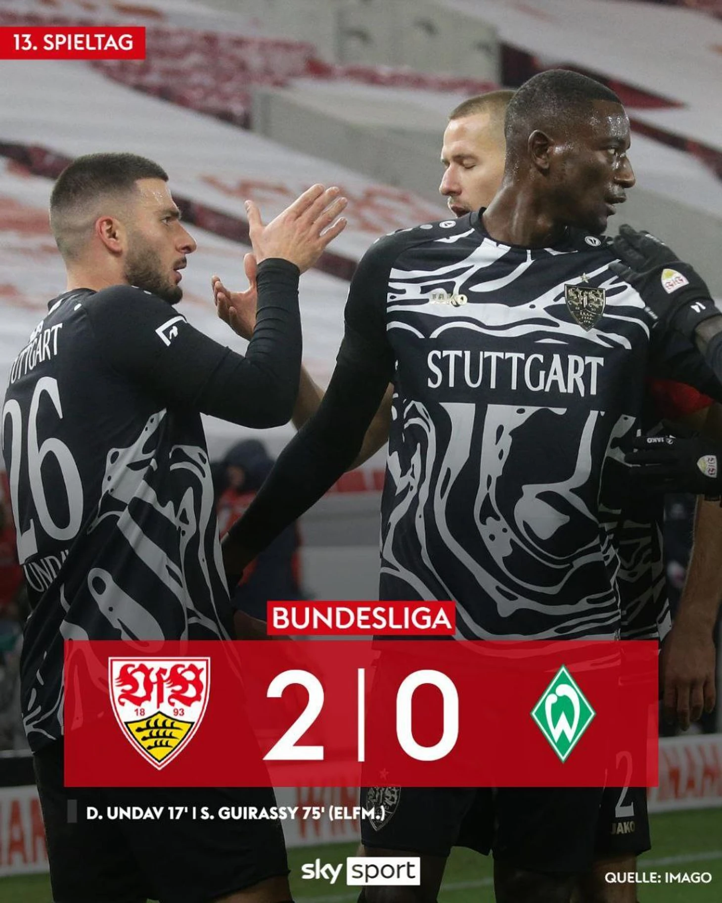 Серу Гирасси и Дениз Ундав принесли «Штутгарту» десятую победу в 13 матчах нынешнего сезона Бундеслиги, что позволило «швабам» закрепиться на 3 позиции в турнирной таблице. На счету Гирасси это уже 16 гол в сезоне.