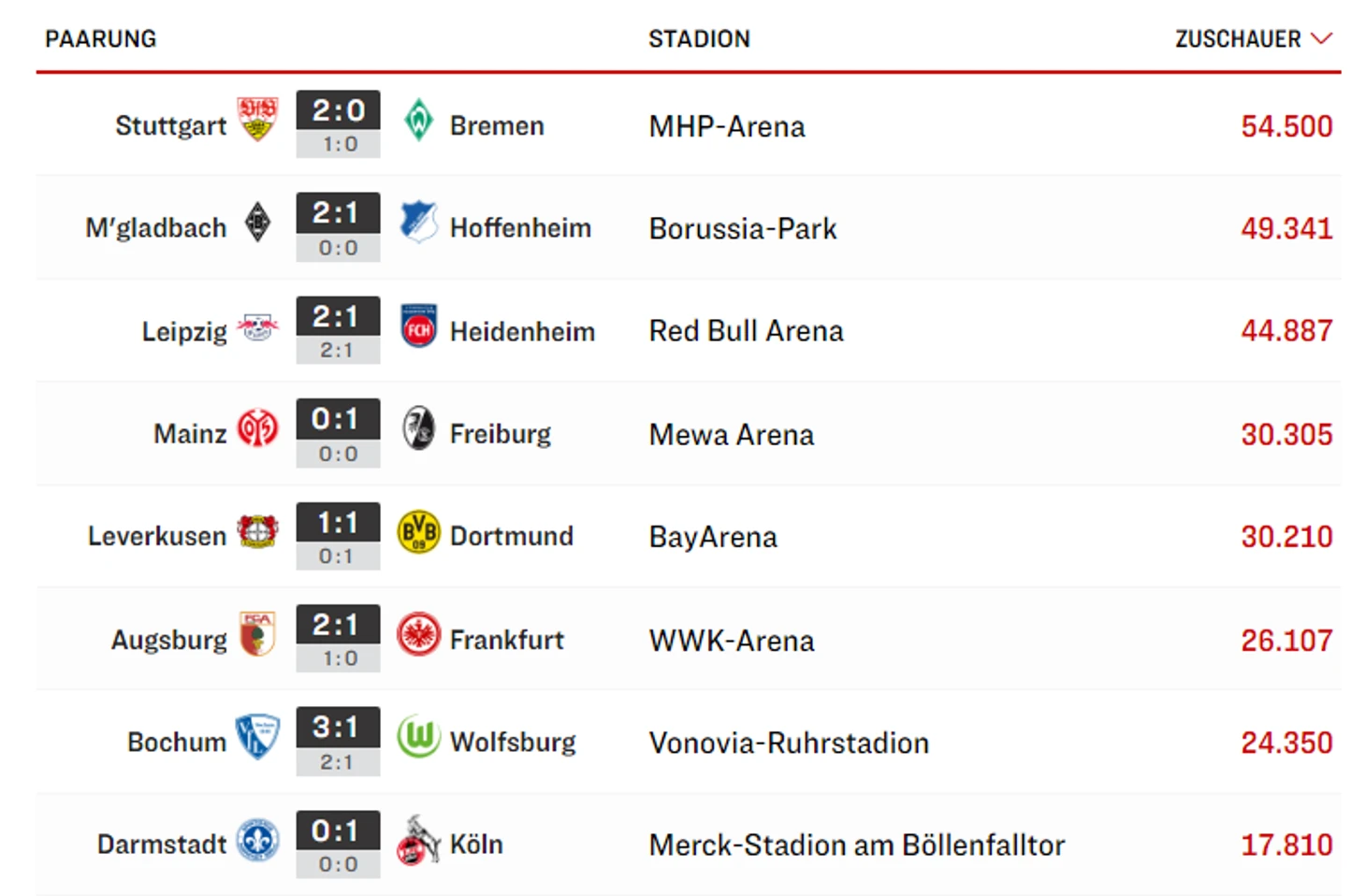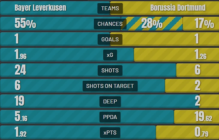 Впервые в этом сезоне «Байер» уступал в счёте после первого тайма. Это также первый матч «Байера» в нынешнем сезоне, когда «фармацевты» не забили больше двух голов в игре.