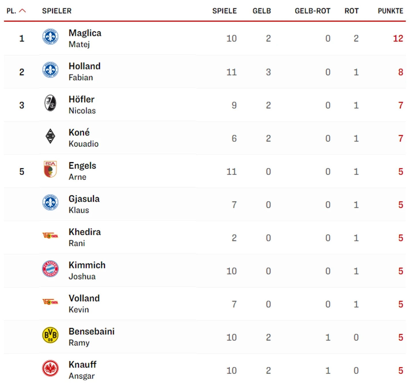 *игрок – кол-во игр – желтые – 1+1 желтые – красные – всего
