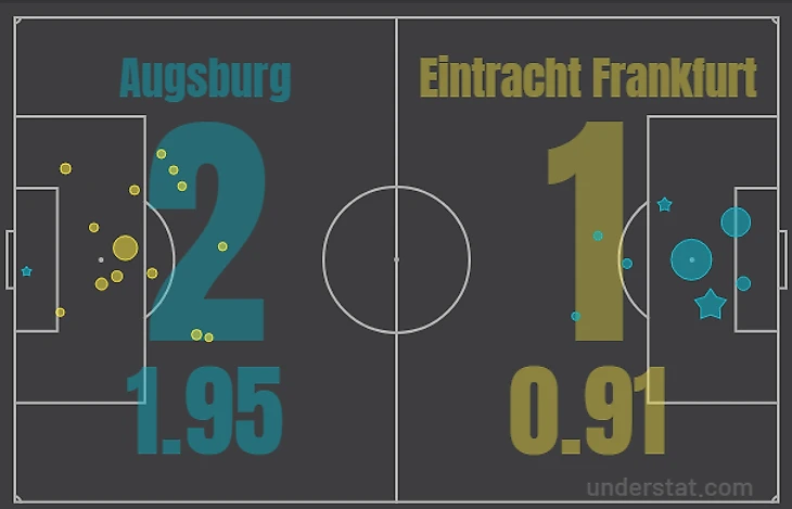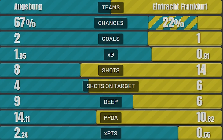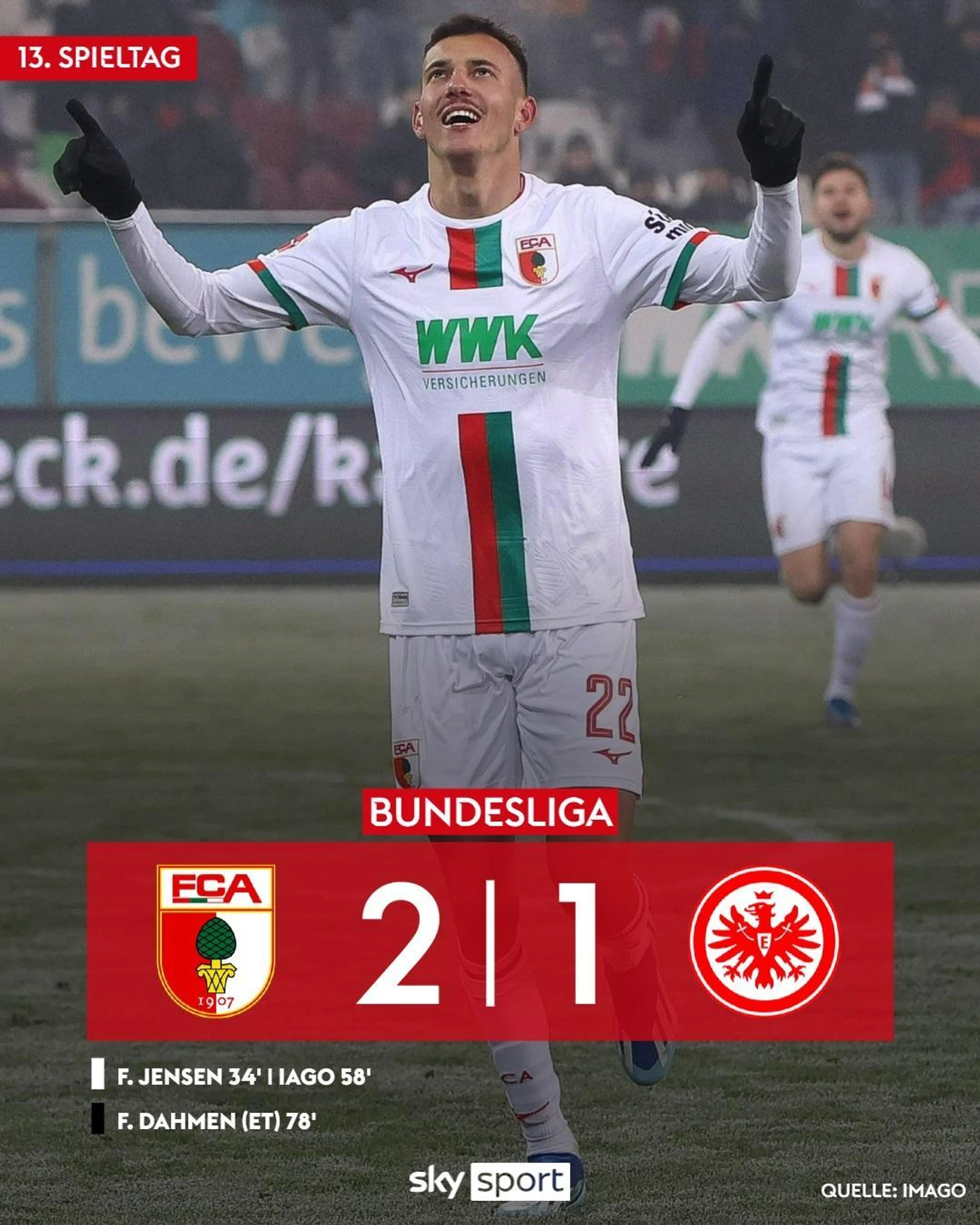 Матч начался достаточно активно. Уже на седьмой минуте «Айнтрахт» организовал убойный момент, но голкипер Финн Дамен был на месте. В общем-то в первом тайме команда Дино Топпмеллера почти ничего больше не создала. Зато «Аугсбург» создал. Первый гол команды отменили из-за офсайда, при втором «Айнтрахт» уже сам подарил сопернику большой шанс. На 35-й минуте Ларссон поскользнулся недалеко от штрафной и подарил мяч Демировичу. Нападающий, сразу же в касание вырезал на Йенсена, который и открыл счет в матче. 1:0 – «Аугсбург» впереди по итогам первого тайма. На первых же минутах второго тайма команда Йесса Торупа могла удваивать преимущество, но Титц немного не попал в ворота уже из вратарской. «Айнтрахт» полностью забрал себе мяч, много бил по воротам, но сказать, что создавал много моментов, наверное, нельзя. Зато «Аугсбург» создавал (при чем для двух команд). На 57-й минуте после подачи Йенсена в штрафную мяч отскочил одинокому Яго, который классным ударом удвоил преимущество хозяев. На 75-й минуте после долгого просмотра ВАР судья все-таки принял решение поставить пенальти в ворота «Айнтрахта», Пако попал в колено Варгасу в штрафной. К мячу подошел Демирович, но переиграть Кевина Траппа ему не удалось. Спустя две минуты Макс классно открылся в штрафной и прострелил, голкипер хозяев пытался перехватить мяч, но в итоге срезал его в свои ворота. Отставание сократилось до одного гола. На последних секундах матча гости получили еще один классный момент, но Нганкам не попал по воротам. 2:1 – «Аугсбург» продлил беспроигрышную серию до шести матчей (12 из 17 очков), «Айнтрахт» не побеждает уже три матча подряд.