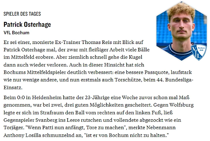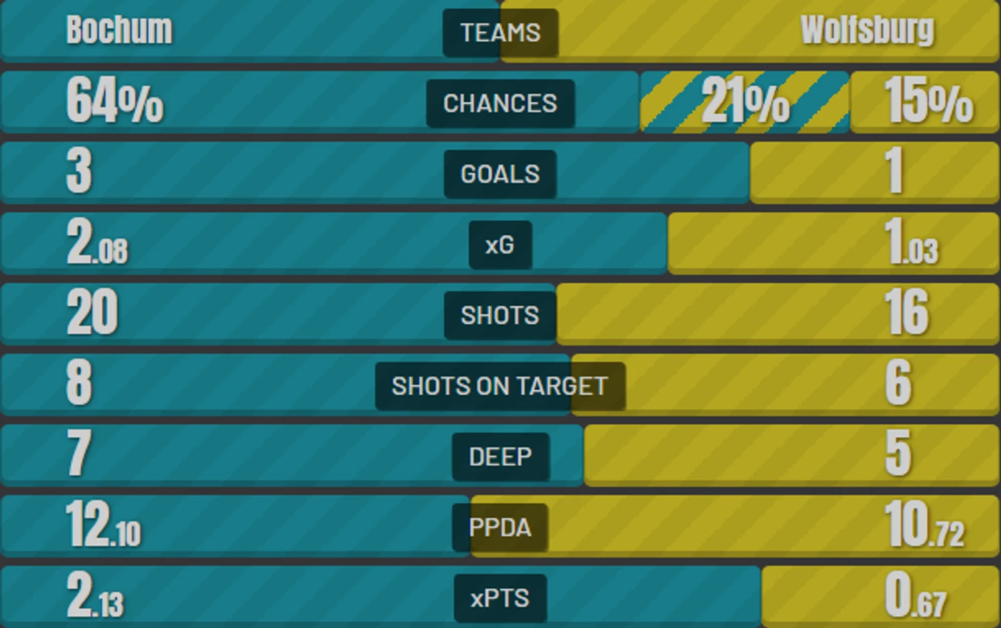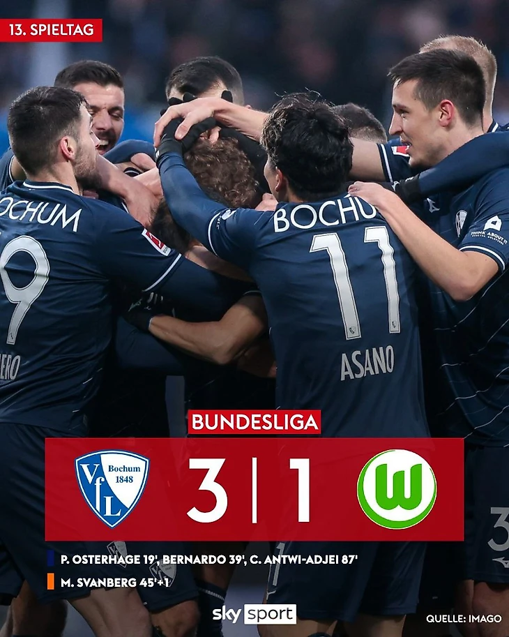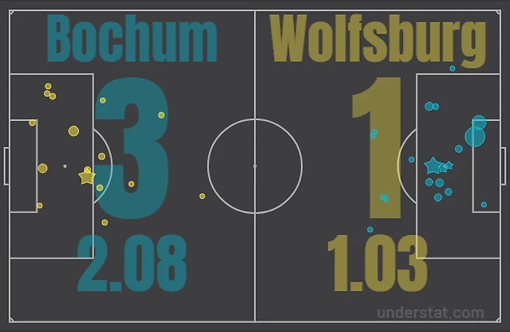 «Вольфсбург» – одна из худших команды этого сезона по игре в гостях. Единственная победа случилась во втором туре (против «Кельна»). С тех пор одни поражения (уже шестое подряд). Матч с «Бохумом» не стал исключением. Счет в игре был открыт уже на 18-й минуте: после очень высокой подачи Лосилла выиграл борьбу около вратарской, мяч полетел к линии штрафной прямо на Остерхаге, полузащитник первым касанием подработал себе мяч, убрал защитника, а вторым отправил мяч мимо Куна Кастельса. Через 20 минут «Бохум» удвоил свое преимущество после серии моментов: сначала Лосилла пробил с дальней дистанции в штангу, потом Асано чуть чуть не дотянулся до мяча на дальней штанге и команда заработала угловой. Штогер подал, Бернардо забил. До конца тайма «Вольфсбург» сумел отыграть один мяч: уже в добавленное время Сванберг вывалился один на один после передачи Винда и реализовал свой момент. Кажется сами футболисты «Бохума» не поняли, что случилось, но офсайда точно не было. 2:1 по итогам первого тайма. Во втором тайме «Вольфсбург» забрал себе мяч, но большой выгоды из этого не извлекал. До 70-й минуты команды пробили по воротам всего трижды (два с дальней дистанции, один заблокированный). Зато под конец матча команды проснулись: 14 ударов за последние 15 минут. В этой перестрелке «Бохум», как кажется, был немного острее. Свой выход один на один «Вольфсбург» не реализовал, в отличие от «Бохума»: на 87 минуте голкипер хозяев далеко вынес мяч, Квартенг головой скинул на Антви-Аджэя, которому надо было только переиграть голкипера. 3:1 – «Бохум» и «Вольфсбург» теперь соседи по таблице.