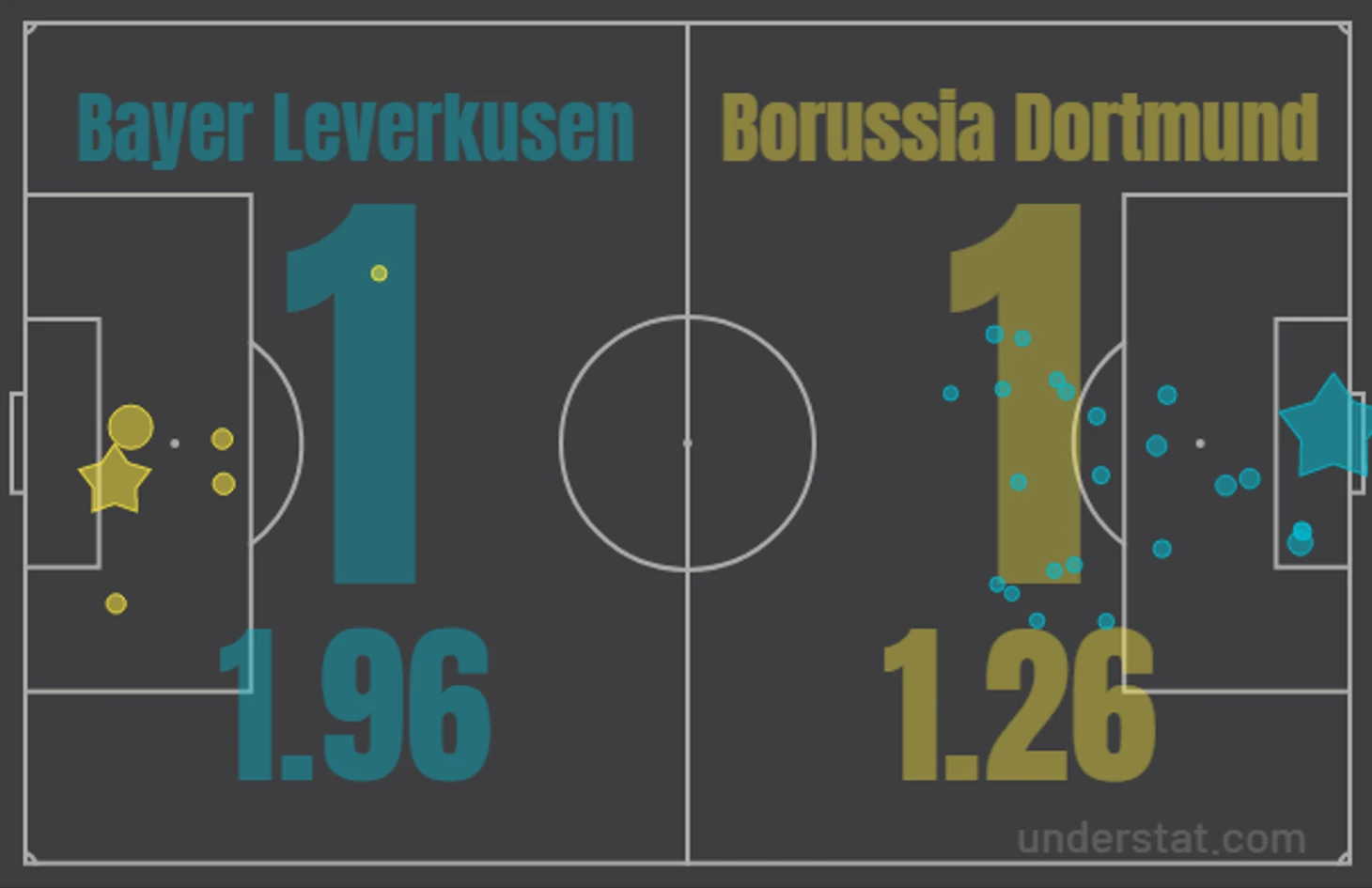 Очень велик соблазн сказать, что «Байер» был сильно лучше: команда больше владела мячом (69 на 31), больше била (23 против 6, 6:2 по ударам в створ) и в целом визуально владела территорией. С другой стороны 14 из 23 ударов Леверкузена – это дальние удары (четыре из них в створ). И при таком количестве ударов Кобель очень мало по настоящему вступал в игру, при всем большом территориальном преимуществе «Байер» создавал мало по настоящему опасных моментов (если кому интересно только два удара «Байера» были выше 0.1 xG). Такому рисунку поспособствовал ранний гол гостей. На пятой минуте затяжная атака Дортмунда привела к голу: Фюллькруг просто шикарно поставил спину защитнику в штрафной, дождался партнера и выкатил Рюэрсону один на один – защитник был точен. Дортмунд получил удобную для себя картину: команда села глубоко оборонять свое преимущество и рассчитывала на контратаки. Но «Байер» почти все их перехватывал, Дортмунд в первом тайме нанес еще только один удар. Хозяева, как уже упоминалось, забрали себе владение и много били с дальней (а иногда и с очень дальней) дистанции. Но все либо мимо, либо прямо в Кобеля. Кроме дальних ударов Леверкузен еще рассчитывал на прострелы, но большинство из них либо прерывалось, либо просто мяч не находил никого в штрафной. Под конец тайма одна из атак хозяев все таки дошла до сетки соперника (как раз после прострела), но в начале атаки у Бонифаса был зафиксирован штрафной. Так команды ушли на перерыв. Второй тайм, в общем-то, не сильно отличался от первого по рисунку матча. «Боруссия» чуть чаще убегала в контратаки, а «Байеру» нужно было рисковать. На 78-й минуте «Байер» все таки сравнял счет. Коссуну протащил мяч через половину поля и классно нашел в штрафной только что вышедшего на поле Шика. Дортмунд, видимо, не успел привыкнуть к игре «Байера» в два нападающих и совсем упустил Патрика: чех покатил на дальнюю штангу и Бонифасе просто закатил мяч в пустые. До конца матча команды большого количества моментов не создали, зато успели немного повздорить на первой добавленной минуте. И Дортмунд и «Байер» провели очень неплохой матч в рамках своей игры – Дортмунд шикарно оборонялся почти весь матч (не помешали даже травмы), а «Байер» территориально доминировал и комбинировал. Гости, возможно, могли чуть больше выбегать в контратаки, а хозяева могли быть точнее в своих ударах. Но не сложилось. 1:1 – ничья в пользу конкурентов.