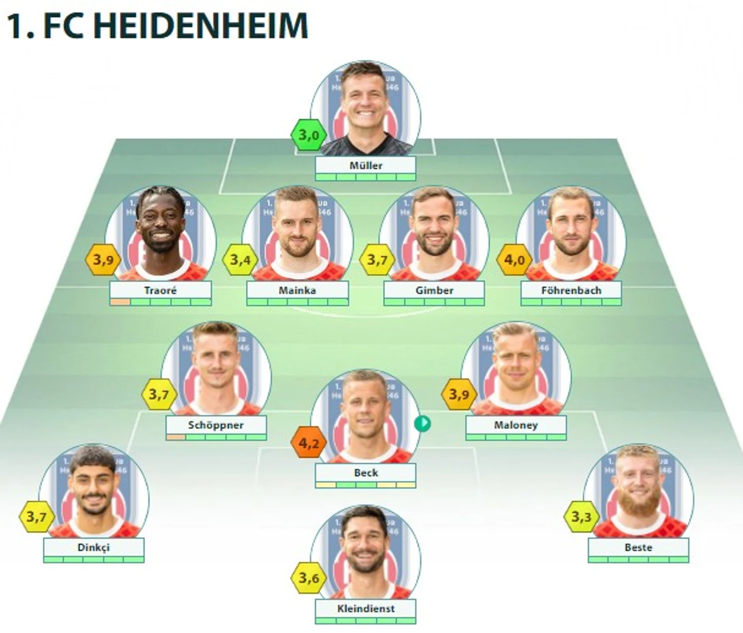 «Хайденхайм»: Мюллер – Траоре, Майнка (c), Гимбер, Ференбах – Мэлоуни, Шеппнер – Динкчи, Пирингер, Бесте – Кляйндинст