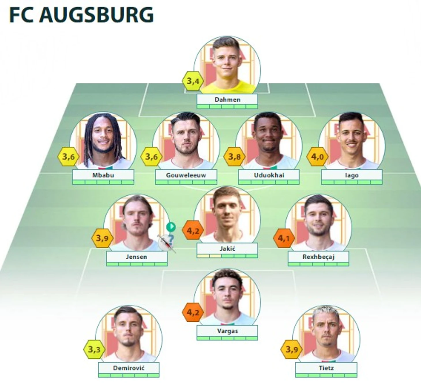 «Аугсбург»: Дамен – Мбабу, Гауэлеу, Удуохай, Яго – Энгельс, Якич, Реджбечай – Варгас – Титц, Демирович