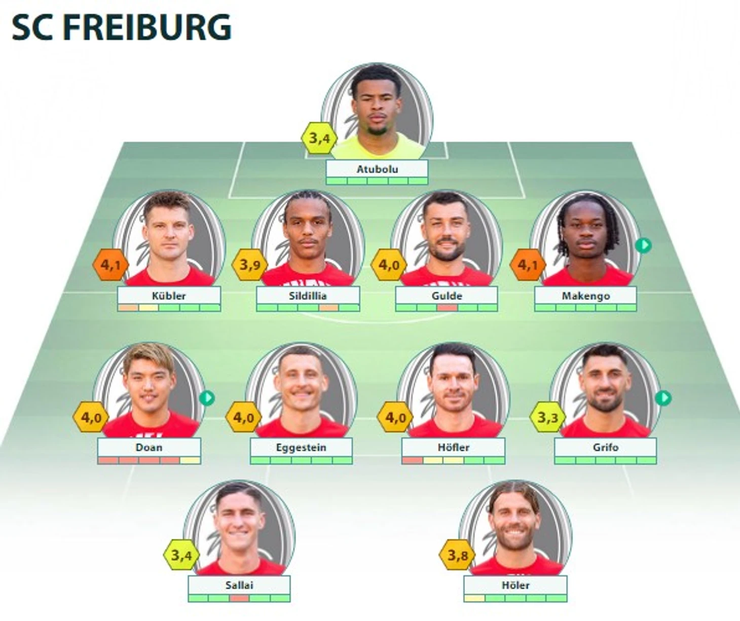 «Фрайбург»: Атуболу – Кюблер, Сильдийя, Салаи, Макенго – Эггештайн, Хефлен – Доан, Шаллаи, Грифо (c) – Хелер