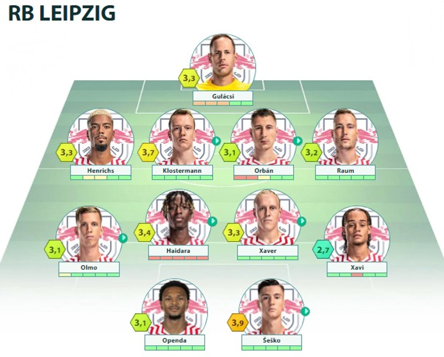 «РБ Лейпциг»: Гулачи – Хенрихс, Клостерманн Орбан (c), Раум – Хави Симонс, Айдара, Шлагер, Ольмо – Шешко, Опенда