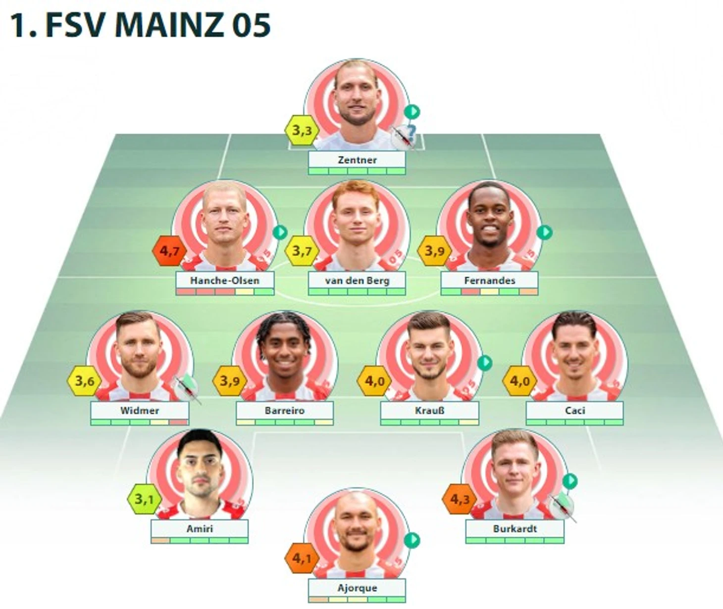 «Майнц»: Центнер – Ханче-Ольсен, ван дер Берг,Фернандеш – Видмер (c), Баррейро, Кор, Каси – Амири, Груда – Ажорк