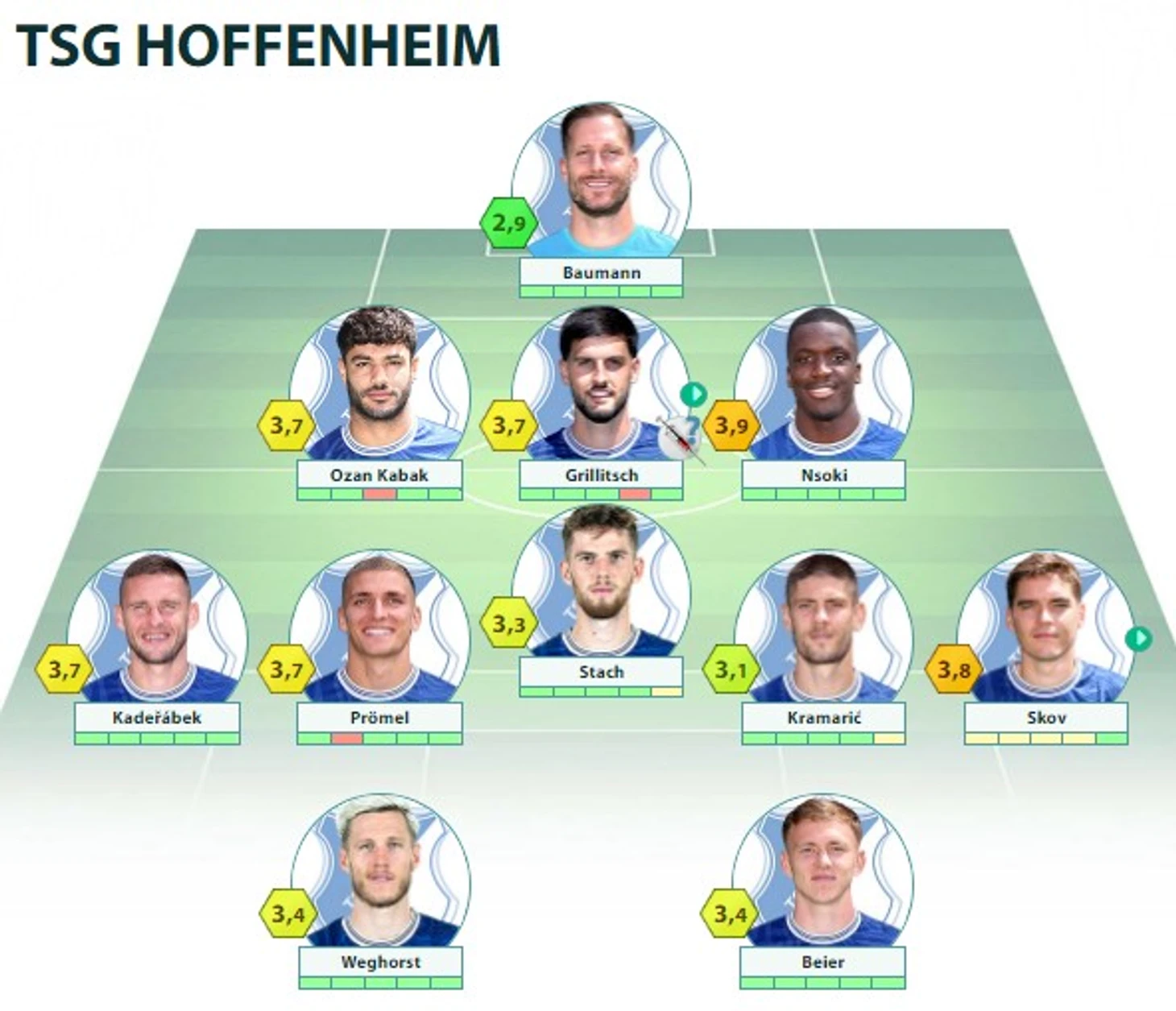 «Хоффенхайм»: Бауманн (c) – Кабак, Брукс, Нсоки – Кадержабек, Премель, Тохумджу, Сков – Крамарич – Вегорст, Байер