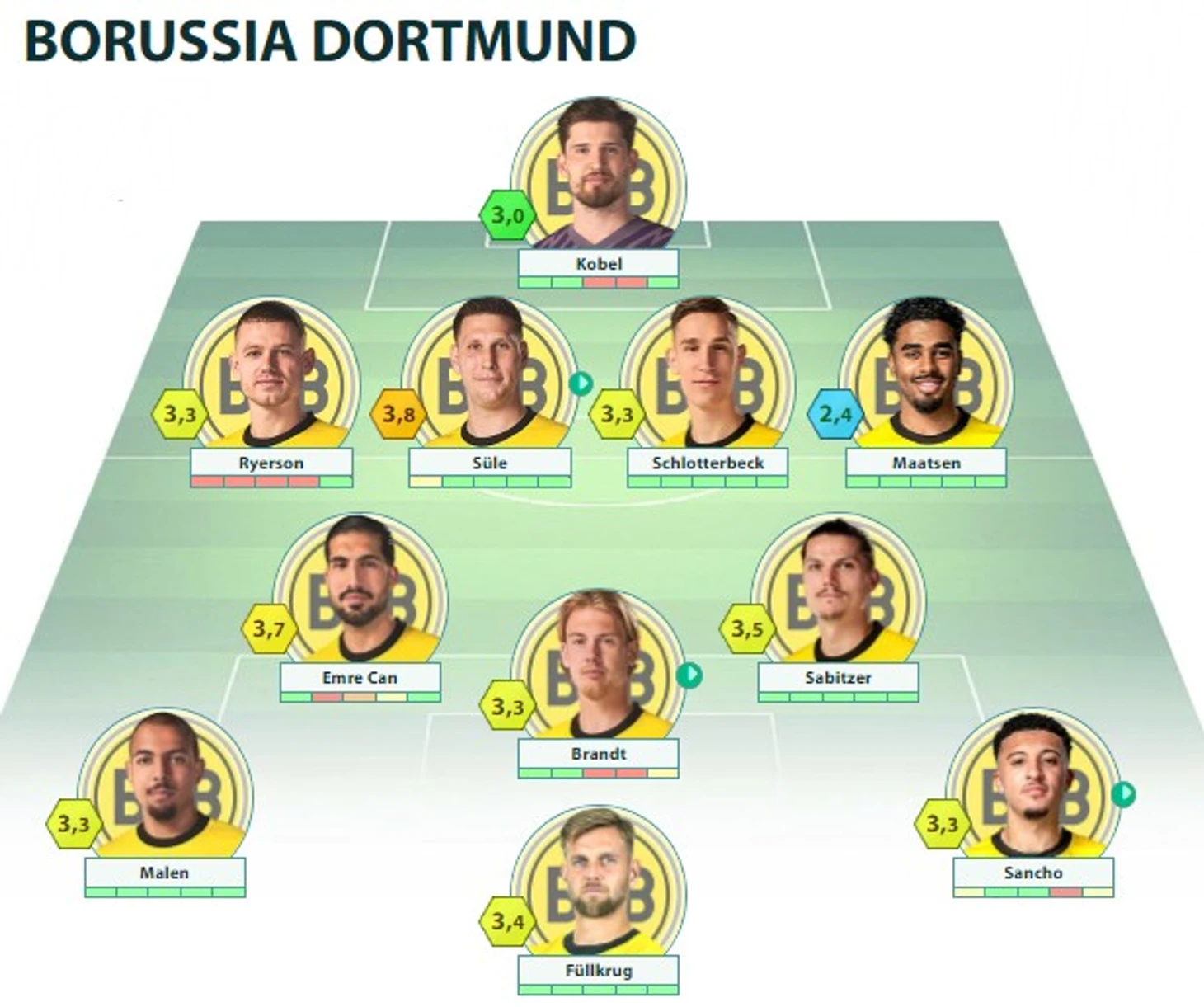 «Боруссия» Дортмунд: Кобель – Рюэрсон, Зюле, Шлоттербек, Матсен – Забитцер, Джан (c) – Мален, Брандт, Санчо – Фюллькруг