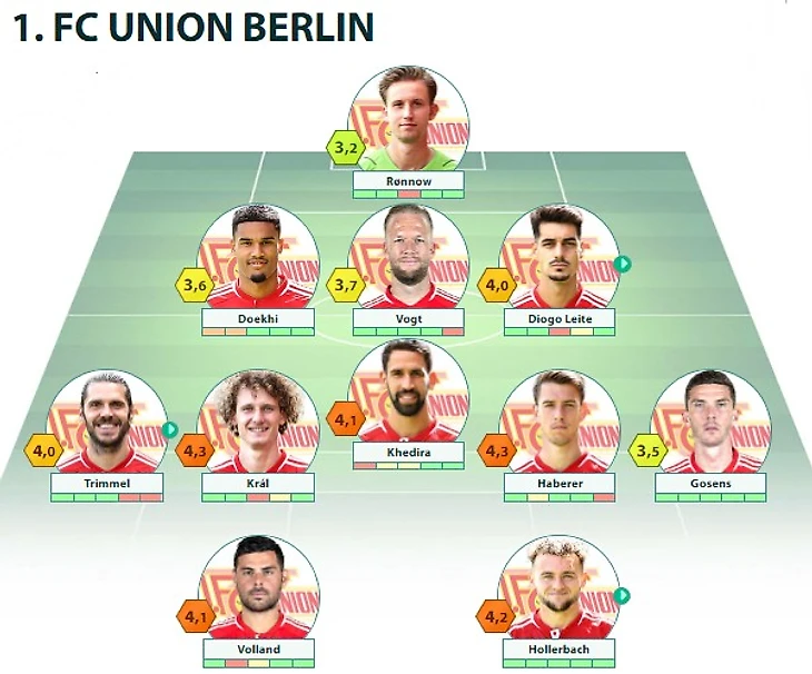 «Унион»: Реннов – Дуки, Кнохе, Лейте– Хедира – Триммель (c), Лаидуни, Хаберер, Гозенс – Фолланд, Холлербах