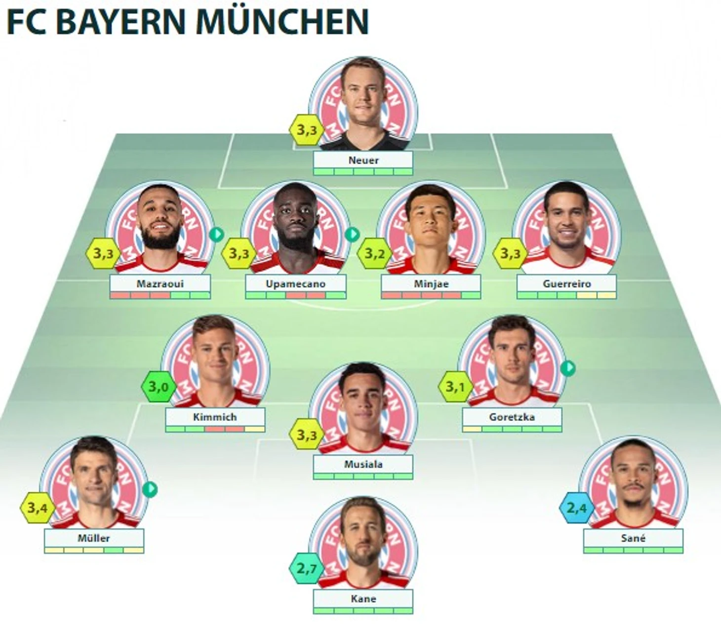 «Бавария»: Нойер (c) – Мазрауи, Упамекано, Ким Мин Чжэ, Геррейру – КИммих, Горетцка – Мюллер, Мусиала, Сане – Кейн