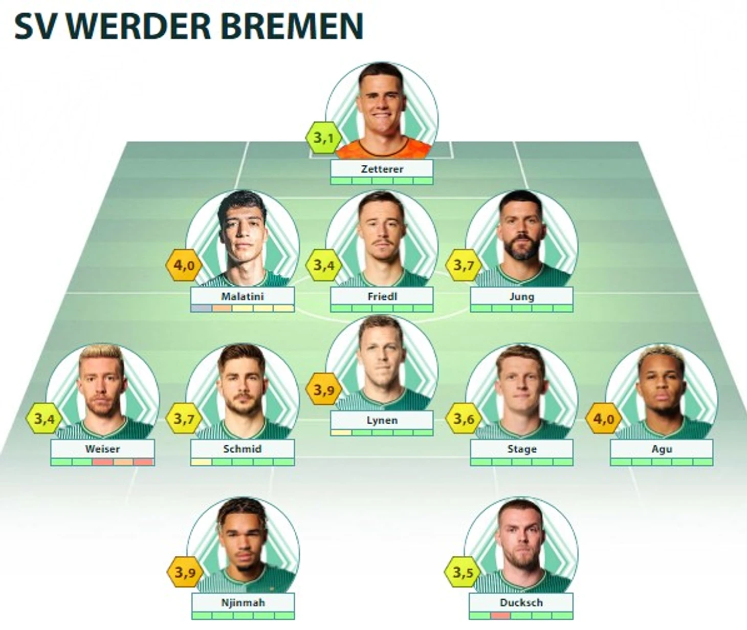 «Вердер»: Цеттерер – Малатини, Фридль (c), Юнг – Линен – Вайзер, Шмид, Стаге, Агу – Нджинма, Дукш