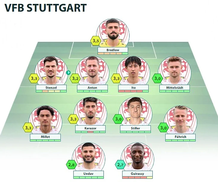 «Штутгарт»: Бредлов – Штенцель, Антон (c), Ито, Миттельштадт – Каразор, Штиллер – Левелинг, Мийо, Фюрих – Ундав