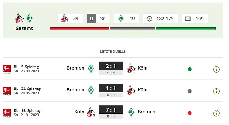 «Кельн» и «Вердер» встречаются в Бундеслиге в сотый раз, и на данный момент у обоих клубов по 36 побед в противостоянии.