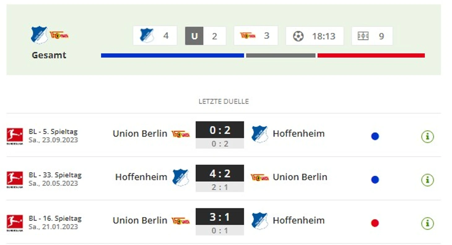 Во всех четырех матчах между «Хоффенхаймом» и «Унионом» в Зинсхайме было забито не менее четырех голов (4:0, 1:3, 2:2 и 4:2) – по 4,5 гола в среднем.