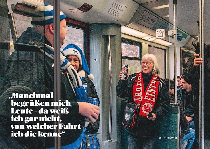Первый адвент, в девять часов утра Кете Йопек сидит в поезде Франкфурт – Берлин. Сумка, очки, шарф – все с логотипом «Айнтрахта». В руках банка в черно-белом цвете: яблочный сидр Auswärtsschoppe – ее любимый напиток. На спине ее футболки вместо имени футболиста написано Äppelwoi (Apfelwein - яблочное вино). Номер 44 – год ее рождения. Немногие на трибуне относятся к поколению времен Конрада Аденауэра, а постоянного спутника, который ездил бы с ней на матчи, у Кете нет. Но ее всегда приветствуют проходящие мимо болельщики: «Привет, Кете, как дела?». Кажется, что даже на выезде она как дома. Кевин-Принс Боатенг незадолго до конца матча забивает победный гол, и она поднимает руки так высоко вверх, как будто хочет коснуться крыши стадиона своими черными перчатками. После шести часов в пути она стоит все 90 минут ради этого момента. Кете возвращается обратно на поезде и смотрит, как за окном падает первый снег. Только около 11 часов вечера она оказывается дома. «Это лучше, чем в пятницу», - говорит Кете. Тогда она ехала на поезде в Кауфбойрен на хоккей, а вернулась только в 8 утра в субботу.