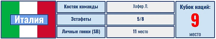 А если убрать за скобки Лизу и Дору, то со сборной совсем беда. Кроме них в этом сезоне больше ни одна итальянка не набирала кубковых очков. Санфилиппо и Гонтье не бегут и не стреляют. А молодежь пока еще очень слаба.