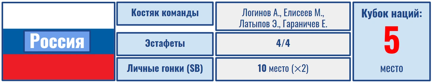 Для мужской сборной России начало сезона выдалось довольно сносным - 5 место в кубке наций и две деревяшки в эстафетах, вполне неплохо.