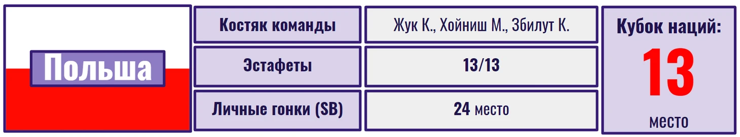 Именно эта команда является одним из самых главных разочарований начала сезона. Что происходит с польками сложно сказать. Грайс продолжил работать со сборной. Но факт остается фактом - команда, лидировавшая на прошлом чемпионате мира после третьего этапа эстафеты с сорокасекундным преимуществом, в этом сезоне дважды финишировала тринадцатой.