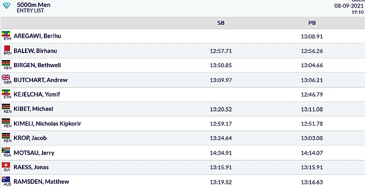 Таким образом главным фаворитом забега стал Йомиф Кеджелча, который после провала на ОИ (там он бежал только "десятку") пока не стартовал, что может и пойдет ему на руку. На Бриллиантовой лиге он вообще не часто появлялся в этом году — имеет только победу в Осло на 3000 м, и на финал отобрался благодаря отказам людей, что выше в зачете. Впрочем, значение имеет только его готовность сейчас.
