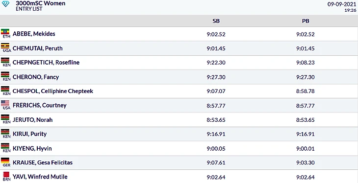 Кенийки Маргарет Кипкембои и Лилиан Ренгерук заняли соответственное 4-е и 5-е места в Брюсселе. Кипкембои перед этим трижды попадала в тройку лучших БЛ: в Осло на 5000 м, в Дохе и Париже на 3000 м. Но, как и Ренгерук, которая в Дохе финишировала за ней на 3-м месте, пока не дотягивает до трех фавориток финала. Их соотечественница Беатрис Чебет даже выиграла первый старт в Дохе, но сейчас показывает совсем не ту форму.
