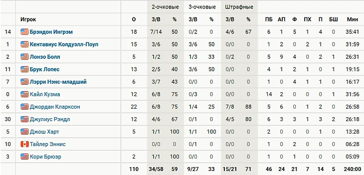 Отвратительная защита Кузмы не помешала ему собрать лучший показатель полезности в команде +21 и вот такую статистику: 12/14/2 + блок при 54.5% с игры, 0% с дуги, 0 потерь за 33 минуты. Все три попытки с дуги были заведомо провальные, поэтому 0% не удивительны, а вот в посте отработал отлично;