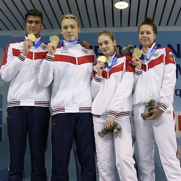 Наш чемпионский квартет смешанной эстафеты 4х100 метров вольным стилем ( Колесников, Минаков, Клеванович, Невмовенко)