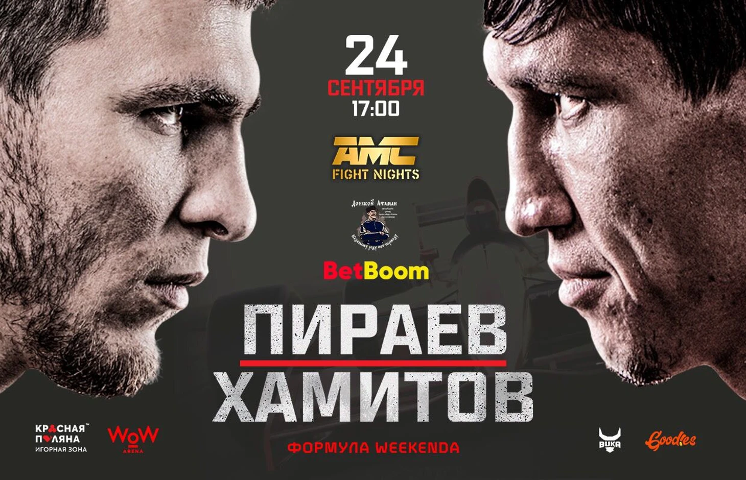 24 сентября в игорной зоне «Красная Поляна» состоится международный турнир по смешанным единоборствам AMC FIGHT NIGHTS в партнерстве с промоутерской компанией «Донской атаман». В главном поединке вечера встретятся Куат Хамитов и Мариф Пираев.