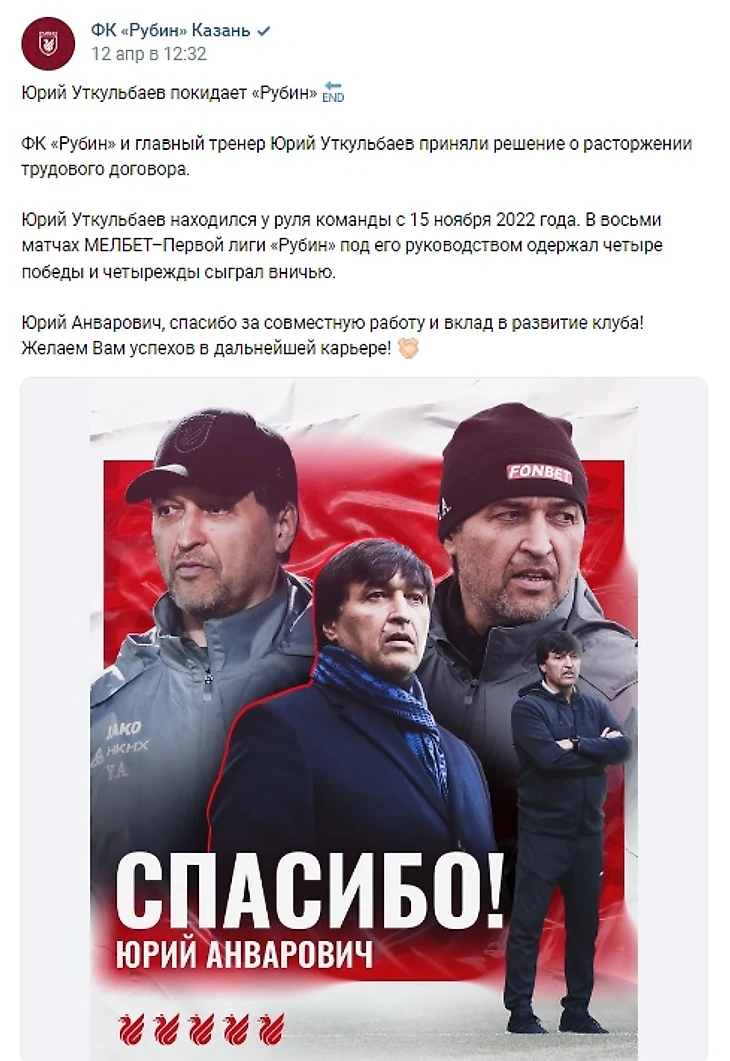 Татаро-башкирское противостояние перешло и в плоскость тренерских отставок: «Рубин» догнал «Уфу» в сезоне по этому показателю - у обеих команд теперь их по две - и они в лидеры турнира в этом почетном соревновании. При том что одна команда вторая сверху, а другая - третья снизу. Уткульбаев покидает казанцев непобежденным, но малопобеждающим. Красно-зеленые обязательно вернутся вместе, но без Юрия Анваровича