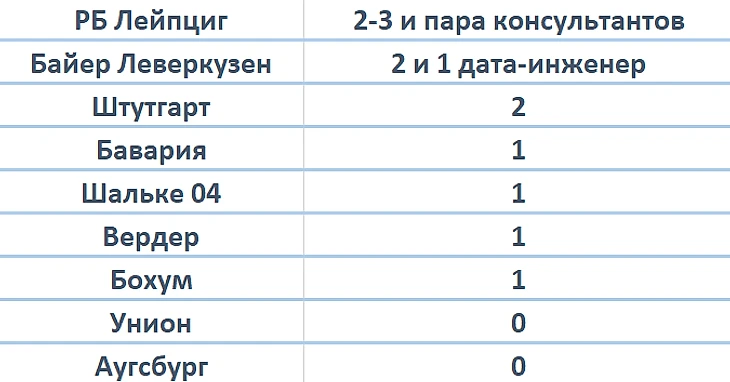Как уже можно понять из нашего материала, в каждой из команд Бундеслиги работают разные специалисты. В первую очередь это связано с оргстукрутой и бюджетами команд. Кто-то может себе позволить несколько человек только для работы с данными, у кого-то один аналитик на все.