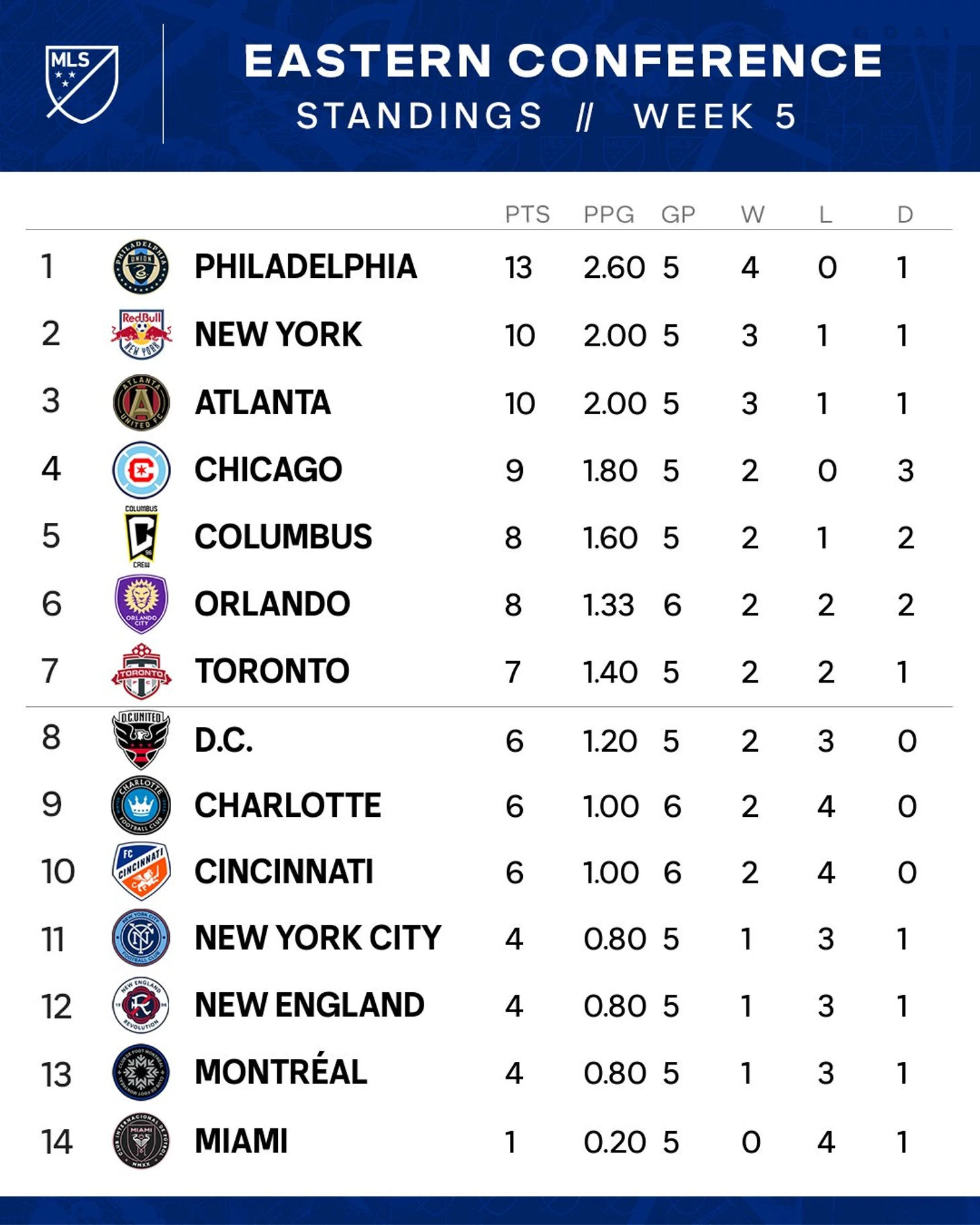 На Востоке без побед идет Интер Майами, действующий чемпион Нью-Йорк Сити испытывает серьезные проблемы на старте сезона, продолжается падение Нью-Инглэнд Революшн и уверенное лидерство Филадельфии Юнион.