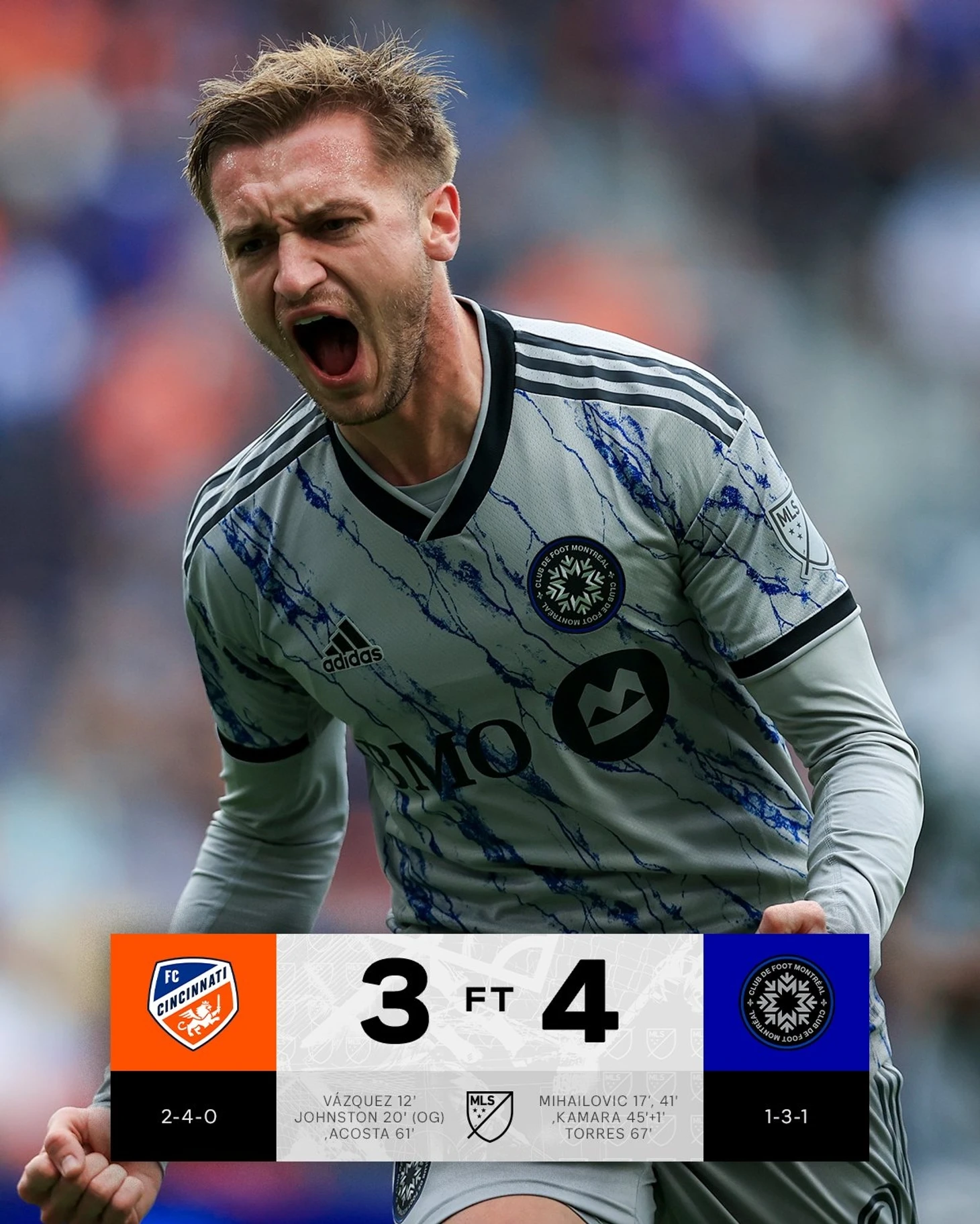 Фестиваль голов и ярких моментов на TQL Stadium становится самым результативным и одним из самых интересных матчей недели. Хозяева больше атаковали, но гости лучше реализовывали свои моменты. К перерыву счет был 2:3 в пользу Монреаля. Во втором тайме игра не успокоилась, но голов стало меньше. На 60-й минуте Акоста реализовал пенальти, а через семь минут Хоакин Торрес установил окончательный счет на табло 3:4 в пользу гостей из Канады. Стоит отметить, что у Цинци снова отличился Брэндон Васкес, на его счету уже 5 забитых мячей в этом сезоне, также стоит отметит дубль Джордже Михайловича из Монреаля.