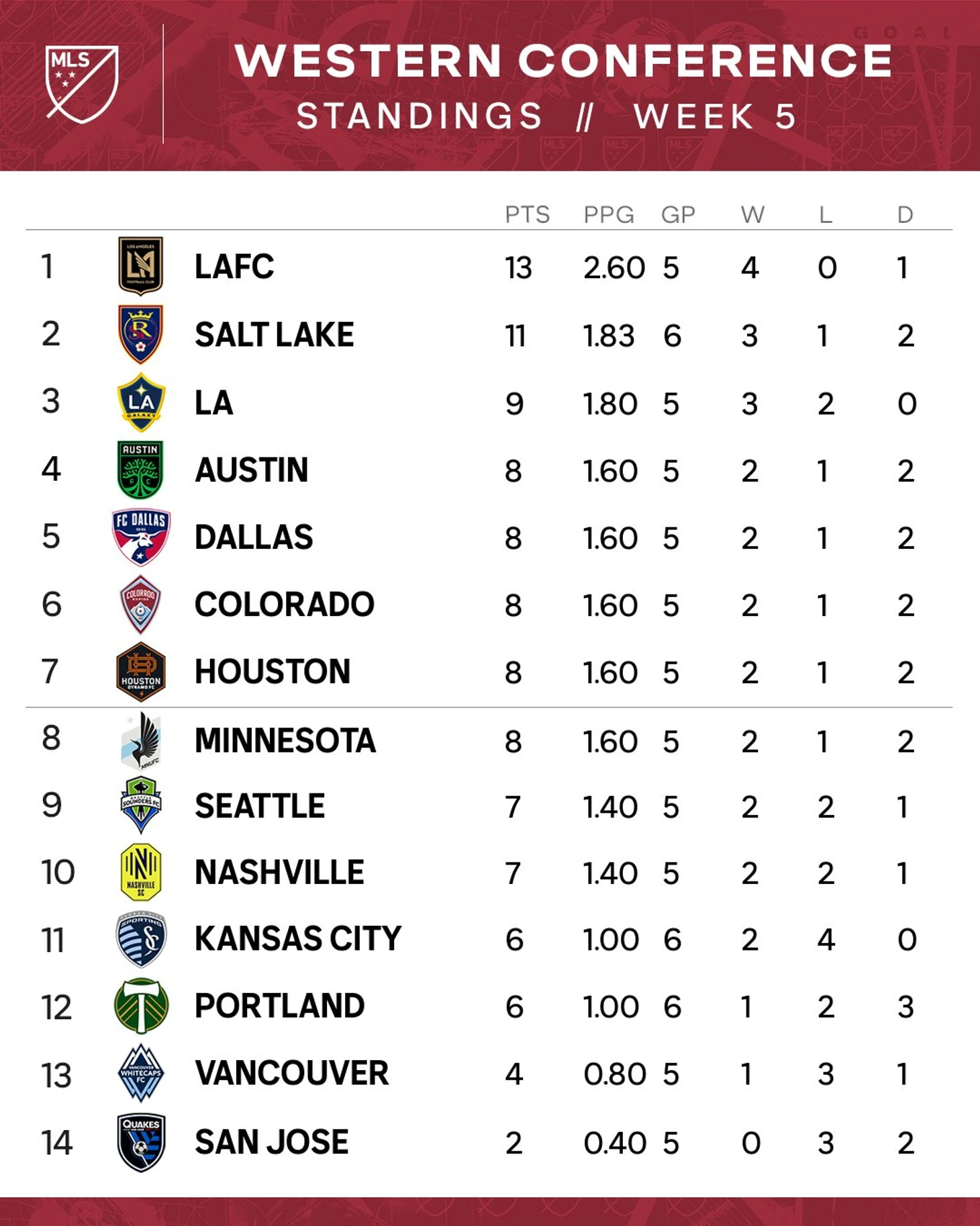 После пятой недели важно отметить первую победу Ванкувера, отсутствие этих самых побед у Сан-Хосе и безоговорочное лидерство Лос-Анджелес ФК.