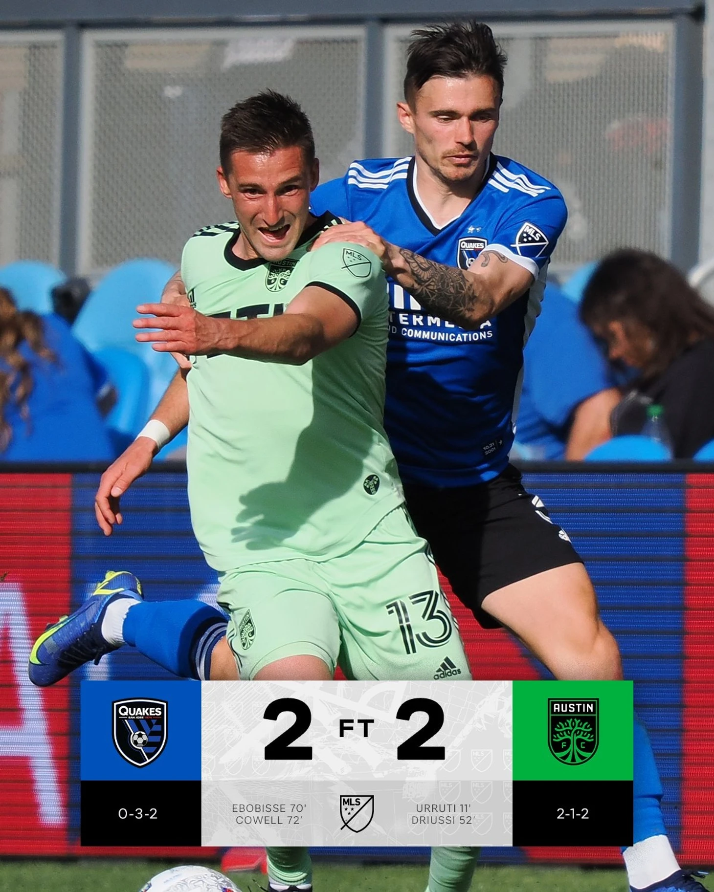 Калифорнийцы продолжают в каждом матче создавать себе проблем, чтобы потом героически пытаться из них выйти победителем. В первом тайме особо нечего отметить, кроме потрясающего гола Макси Уррути в ворота Сан-Хосе. Вторые 45 минут стартовали с преимущества Остина, которое вылилось в пенальти в пользу гостей. Себастьян Дриусси в погоне за Брэндоном Васкесом уверенно реализует удар с точки, у аргентинца теперь 4 гола в активе. Но как я уже говорил, Сан-Хосе любит героически возвращаться в игру в этом сезоне, на 70- минуте Джереми Эбобиссе реализует пенальти, а на 72-й Кейд Кауэлл сравнивает счет. После финального свистка счет на табло 2:2, полностью справедлив и закономерен.